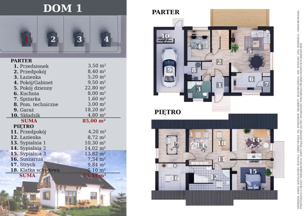 Nasze domy są wykonane z wysokiej jakości materiałów. Domy posadowione na płycie fundamentowej, ocieplone 20 cm styropianem, z ocieplonym poddaszem pod dachówką ceramiczną. Ogrzewanie podłogowe w całym domu oraz pompa ciepła gwarantują bezobsługowy tryb zapewnienia w ciepło. Ekspozycja dachu na południe umożliwia zamontowanie fotowoltaiki.