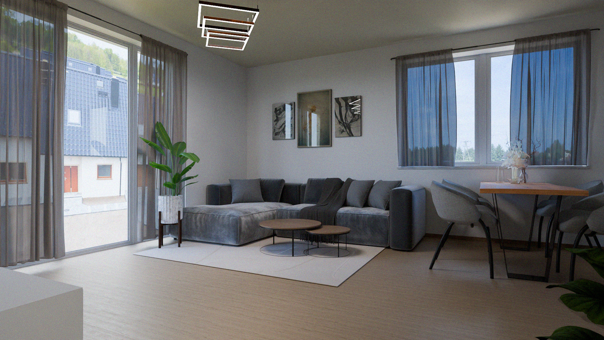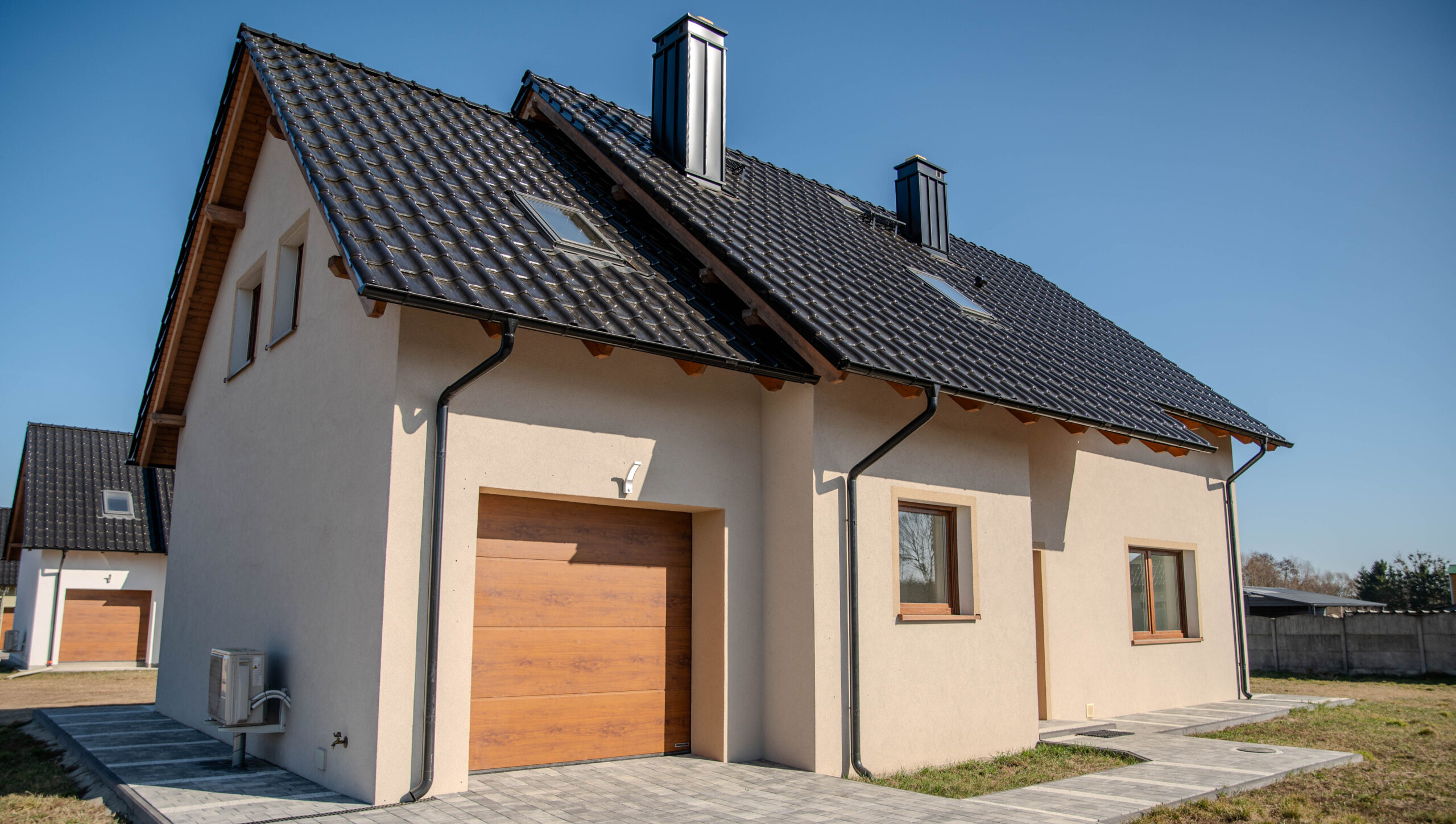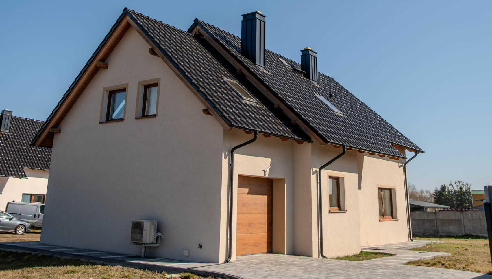 Budynek prezentuje się elegancko i nowocześnie dzięki dachowi o czarnym połysku, co nadaje mu wyrazisty charakter. Biała elewacja kontrastuje z ciemnym dachem, dodając subtelnego uroku i podkreślając czystość formy architektonicznej. Okna koloru złoty dąb dodają ciepła i naturalności, tworząc harmonijny związek z otaczającym krajobrazem.